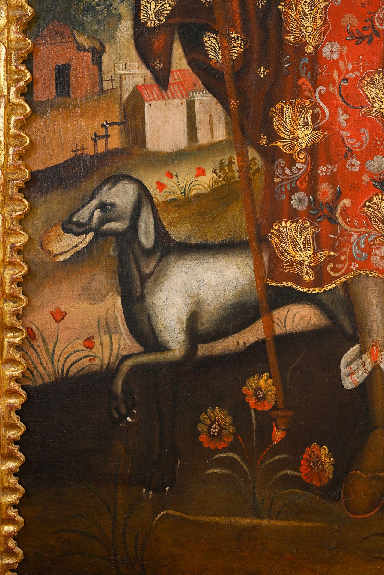 Saint Roch is one of the emblematic figures of the faith much appreciated by the court of the Spanish Bourbons. In Peru he is invoked against diseases and revered as the patron of surgeons. The imposing format of this canvas reveals the importance given to this figure represented here dressed in a rich embroidered coat enhanced with gold just like that of the angel who accompanies him on his right.