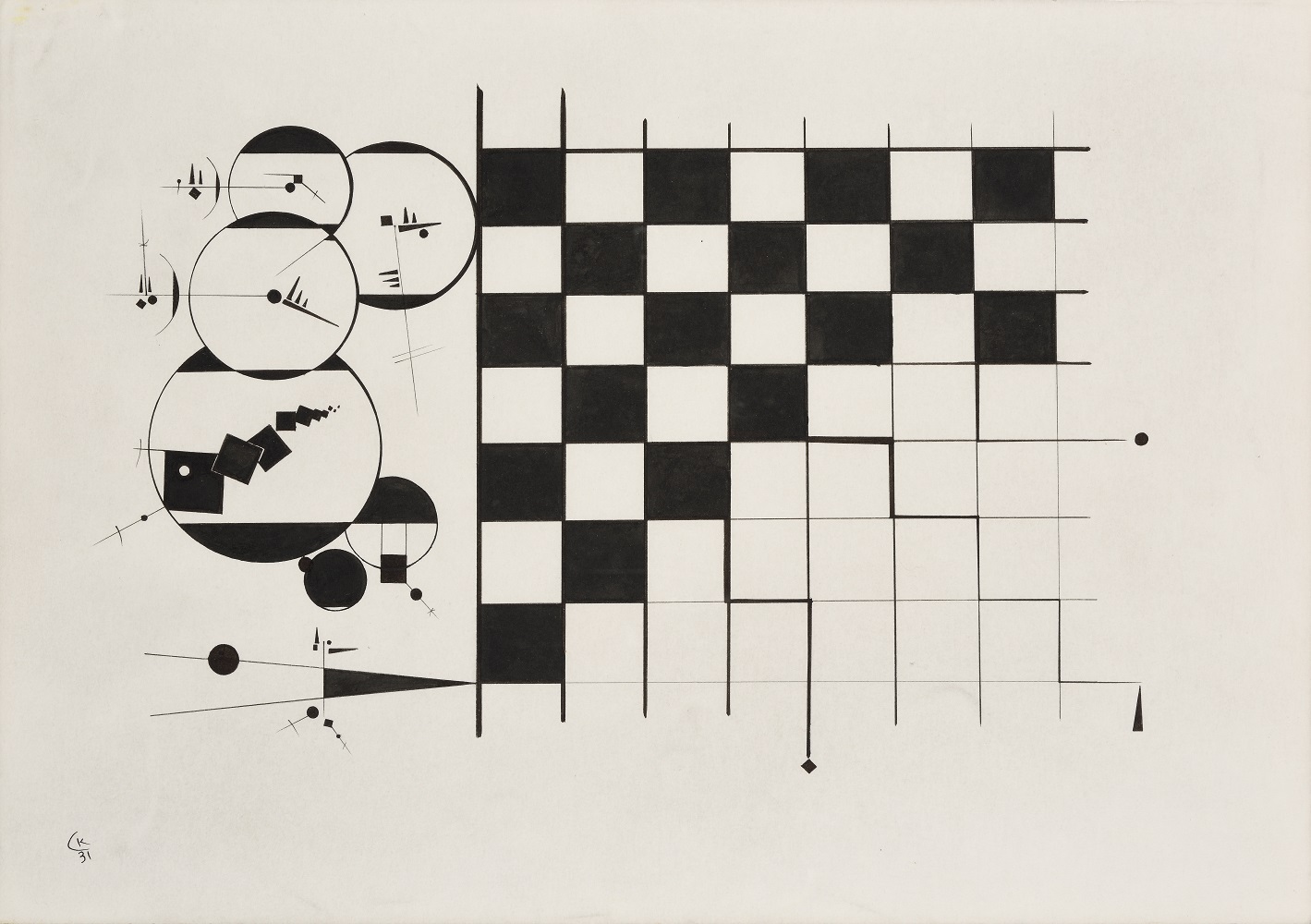 Dated 1931, the Composition which we present dates to the Bauhaus period. Here the artist plays with the checker board pattern which appears in his work for the first time in 1922 in a picture entitled Black Frame, which develops around a black and white chequered pattern. Here the checkerboard motif is more developed and occupies a major portion of the paper, but the alternation of white and black squares remains unfinished. On the left side, circles surround triangles and squares. This composition illustrates Kandinsky’s conception of the circle as linked to the fourth dimension. Bringing together contrasts in a single form, this geometric form frequently appears in the artist’s work.