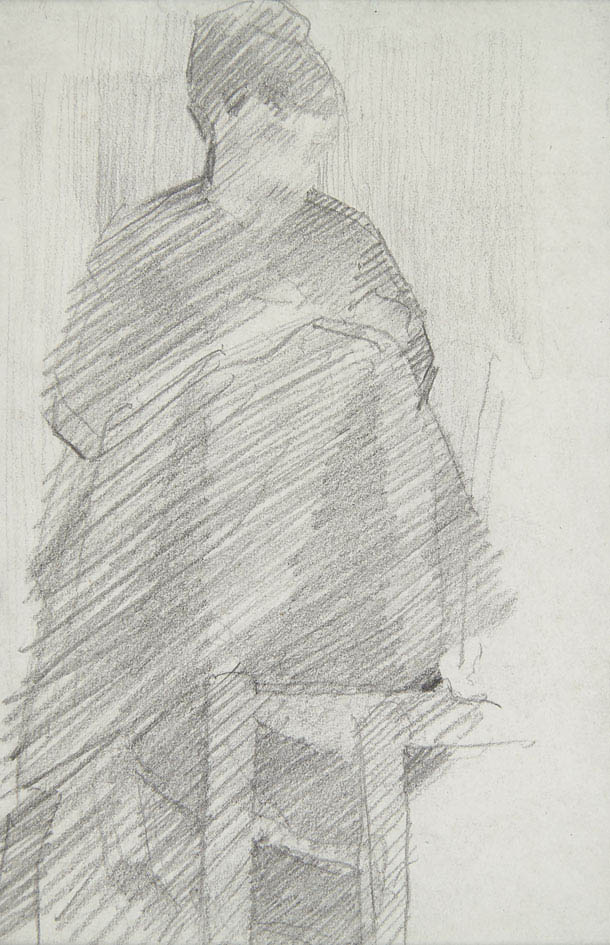 As a draughtsman, Seurat quickly learned to isolate small fragments of daily life and simplify them. In Seurat’s drawings, the line plays a secondary role, with the white of the paper providing light to the subject, piercing between strokes of pencil, between shadows stretched across the paper. **Our Young Girl Sewing** is almost a “classic” Seurat figure, as he had early on adopted the repetition of identical formal elements in his work. Indeed, by the time of this drawing, Seurat had already produced dozens of drawings of men and women from the streets of Paris, the suburbs, or the countryside. The seamstress is thus a figure frequently found in Seurat’s sketchbooks.
