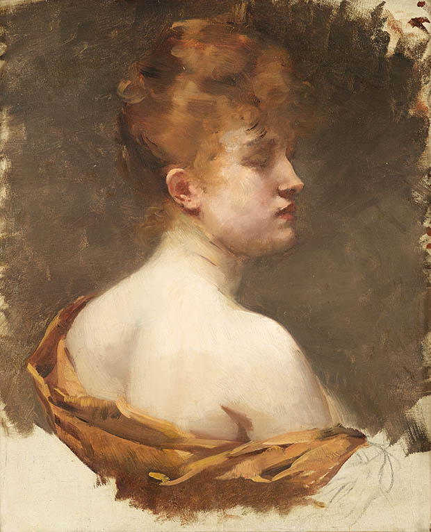 Thus our painting is a portrait full of the grace of an unknown young woman placed very simply with her head in profile and the back of her shoulders seen in three quarter view illuminated by the type of high overhead lighting the painter preferred. The sitter’s flame-colored hair is lifted in an early 20th century style, but her clothing is reduced to ochre drapery sliding off her milky white shoulders. Relying on solid drawing which fixes the outlines of her pointed nose and the suave line of neck and shoulders, Besnard’s brush skims the canvas rapidly and accurately. His fluid brushstrokes spread, are superimposed one over another, intersect, and zigzag as they shape volumes with precision and the distinctive insistence characteristic of Besnard’s works at the beginning of the century. The orange, brownish, yellow, and madder tonalities come together as if in a musical score: however many strokes of pure color produce as many accents, so the areas between paint-loaded passages and those where cream-colored lower layers shine through act as nuances.