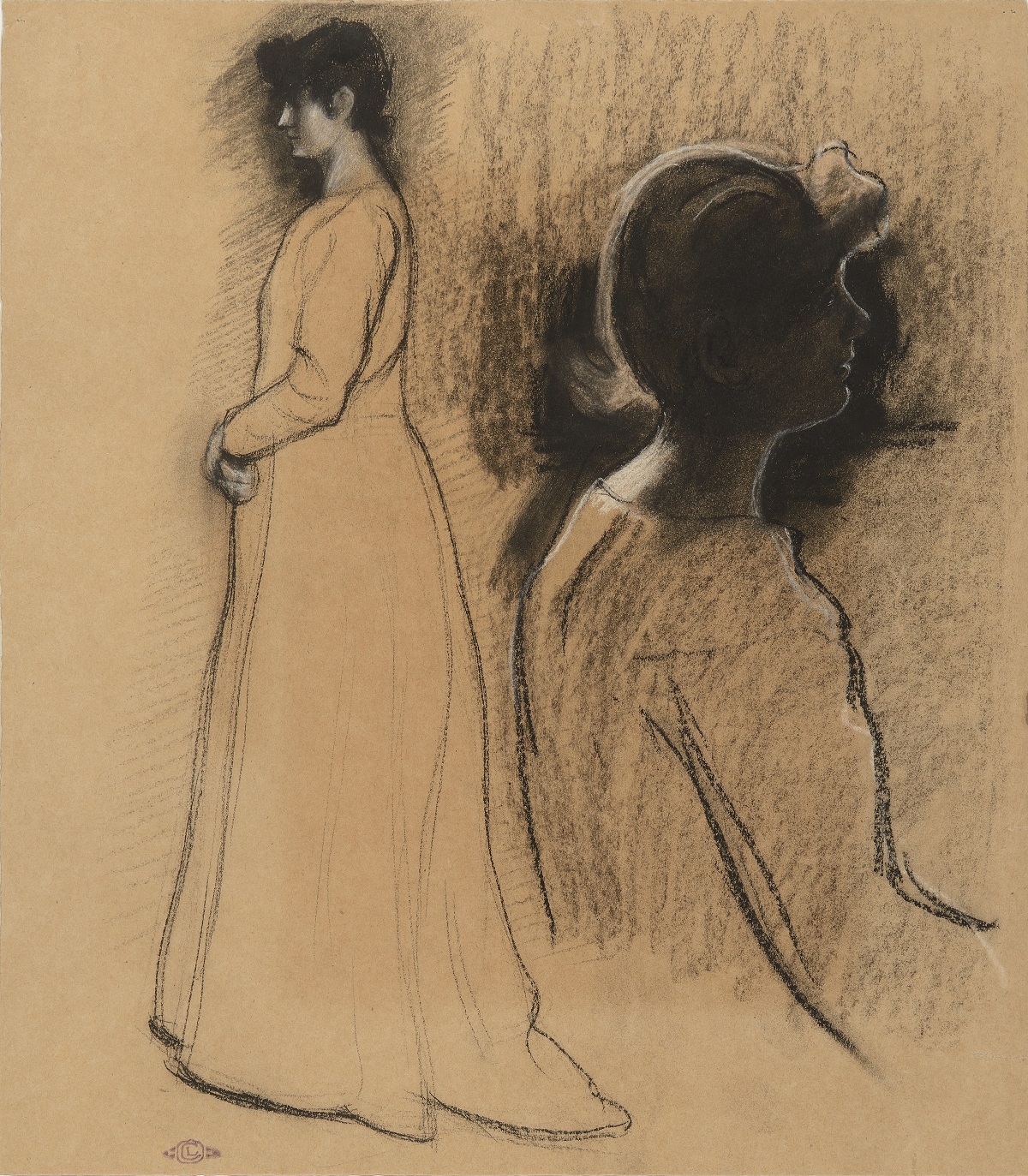 Lemmen esquisse ici un double portrait de femme dénué d’attributs, où l’on reconnaît son épouse. Dans la partie gauche de la feuille, de longues lignes de fusain dessinent la silhouette de profil de la jeune femme debout, les mains reposant l’une sur l’autre. La robe ample, sans corset, est campée en quelques traits efficaces. La pierre noire et le fusain dessinent plus précisément le visage, rehaussé de craie blanche. Des hachures régulières suggèrent le fond. Lemmen avait déjà dessiné Aline Maréchal debout, de strict profil, avant son mariage. La jeune fiancée fait place ici à la femme dans sa plénitude, dont on connaît un autre portrait de profil très proche, Madame Georges Lemmen (1903-1907, sanguine et mine de plomb, 39,5 x 27 cm, collection particulière).