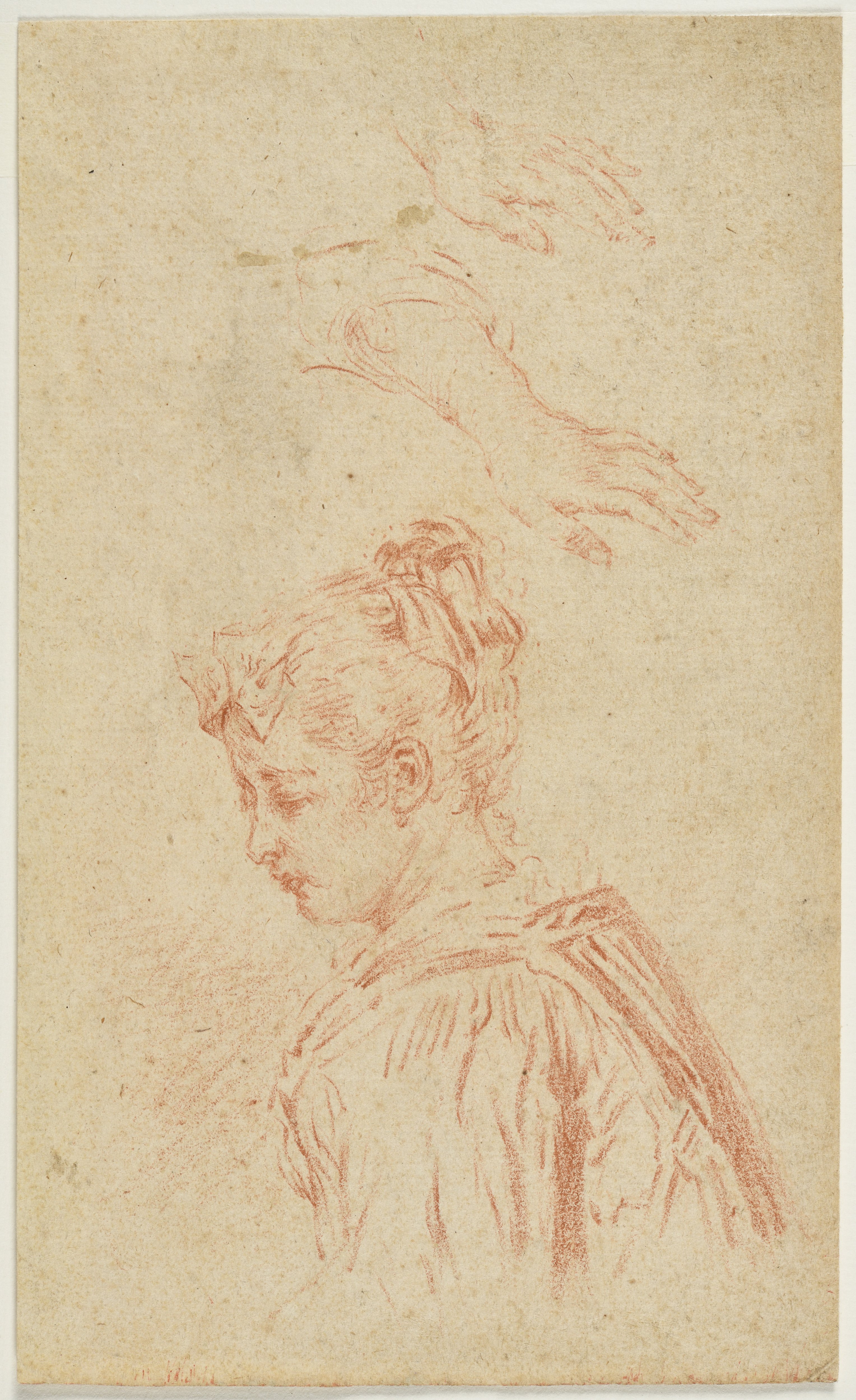 Pour la réalisation de ces œuvres majestueuses, l’artiste multiplie les esquisses d’après nature comme source infinie d’inspiration pour les différentes poses et expressions de ses figures. L’œuvre que nous vous présentons est un remarquable exemple de ces études. Sur une feuille de dimensions restreintes (probablement issue d’un carnet de dessins de l’artiste) sont tracés à la sanguine les contours du profil d’une jeune femme d’une étonnante sensibilité. Durant toute sa carrière, Watteau travaille à l’élaboration d’un type féminin caractéristique ainsi qu’à la variété de leurs poses et attitudes. Observateur attentif, il accorde une grande attention dans le rendu des détails. La mode contemporaine tient par ailleurs une place importante dans son œuvre, les détails des robes et coiffures sont rendus avec une grande acuité. On observe ici un ruban soigneusement noué dans les cheveux du modèle partant du haut d’un chignon et retombant sur le front que l’on retrouve dans d’autres études (ill. 1 et 2).