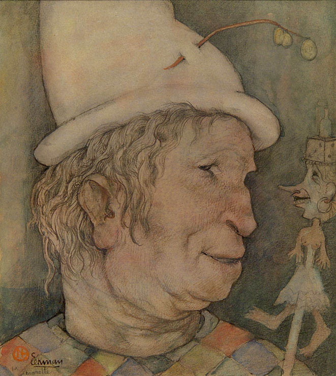 Notre dessin représente un personnage vu de profil tenant dans sa main une marionnette. Ce dernier porte une tenue comparable à celle d’un arlequin ainsi qu’un bonnet décoré d’une branche d’olivier. Son visage est pétri par les années et se caractérise par un profil creusé et découpé. Il regarde en souriant sa marionnette, qui lui répond elle-aussi par un large sourire. Chez Eekman, peu d’horizons lointains limitant de vastes espaces derrière ses sujets, car ce sont eux qui intéressent l’artiste.
