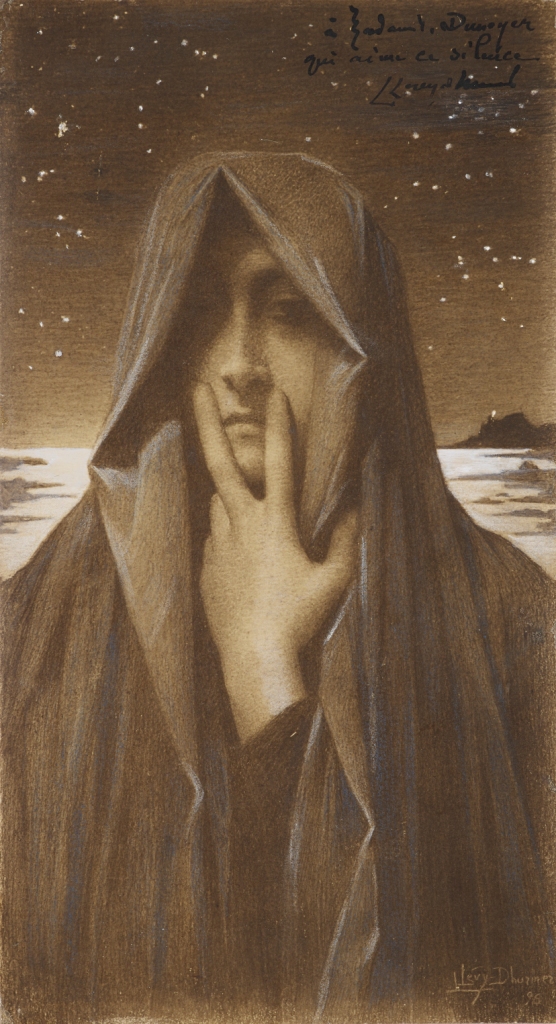Avec une science avisée de la construction et une exquise pureté de ligne, Lévy-Dhurmer place cette figure drapée dans un format vertical qui accentue son hiératisme. La sobriété de moyens accuse la puissance du geste, comme le sentiment de mystère serein qui s’en dégage. L’emploi du pastel conforte l’impression fugitive d’une apparition. Entre présence et absence, le regard tourné vers le spectateur, qu’il interpelle en lui intimant de se taire, est à demi dissimulé derrière le voile. Le graphisme est serré, le modelé sensible du visage et de la main a la douceur d’un Léonard de Vinci, quand les plis sont traités plus largement. L’artiste, qui prit peut-être pour modèle la comtesse Vitali, place cette figure énigmatique devant un paysage marin exempt de références, sous un ciel constellé d’étoiles dont la dimension cosmique suggère l’idée d’éternité.