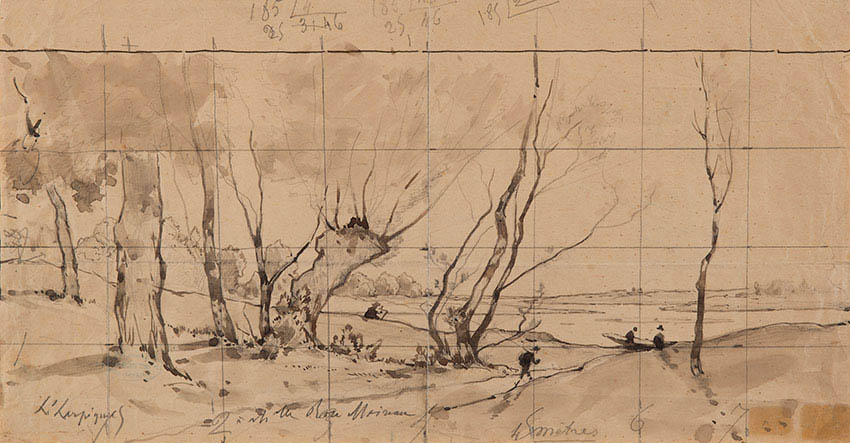 Pierre noire, plume et lavis gris sur mise au carreau à la pierre noire. Signé Harpignies en bas à gauche, avec un envoi à Mlle Rose Moisneau et d’autres annotations à la pierre noire.