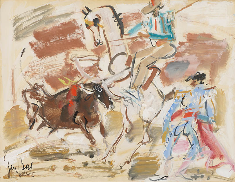 S’il cesse de voyager en 1966, l’artiste continue de dessiner énormément. Dans les années 1960, la ligne noire, mouvementée et puissante, prend définitivement le pas sur la forme. Il n’y a plus de perspective ni d’arrière-plan et de larges traits noirs décomposent la représentation, comme dans la Corrida, située à Bilbao et datée de 1968 (vente Artcurial du 24 mars 2011, Paris, lot 412). On y reconnaît le peón de dos, les jambes écartées, présent également dans notre dessin. Mais l’on ne peut plus que deviner le picador et son cheval derrière cet amoncellement de croix, de points et de zigzags dont certains semblent venus de la calligraphie orientale.