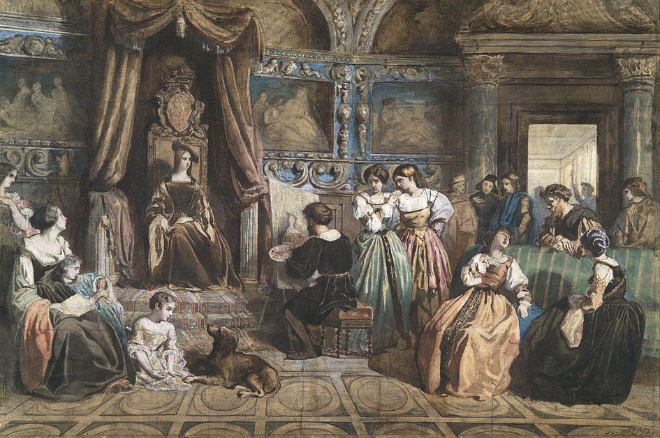 Dans notre aquarelle, c’est une scène importante de l’histoire de l’art du XVIIe siècle que Camille Roqueplan choisit de représenter : en 1632, Anthony Van Dyck fut invité à la cour du roi Charles Ier d’Angleterre dont il deviendra le peintre officiel. Il réalisa de nombreux portraits de la famille royale et notamment de la Reine Henrietta Maria.