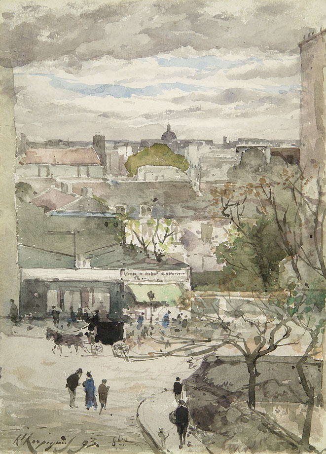 Davantage connu pour ses paysages naturalistes, Harpignies réalisa cependant quelques vues parisiennes, et étudia l’aspect de la ville aux différentes heures de la journée. La délicatesse et la subtilité de cette oeuvre en est un excellent exemple.