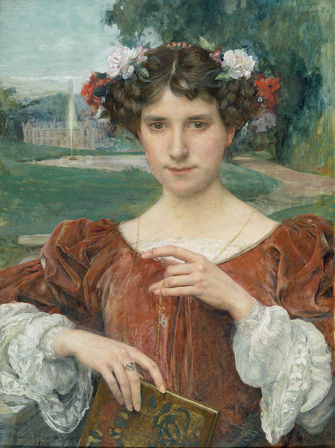 À l’image de notre magnifique pastel, la figure féminine empreinte de mélancolie évolue dans un univers situé aux frontières du réel et du légendaire, souvent intemporel. Le château à l’arrière plan relève t‑il de l’imaginaire du peintre ? La jeune fille semble affronter le regard du spectateur, mais intrigue en laissant son geste en suspend, comme dérangée par cette intrusion. Telle une figure allégorique sa coiffure est délicatement parsemée de fleurs, tandis que son costume médiéval la fige dans une posture plutôt anachronique pour un portrait bourgeois.