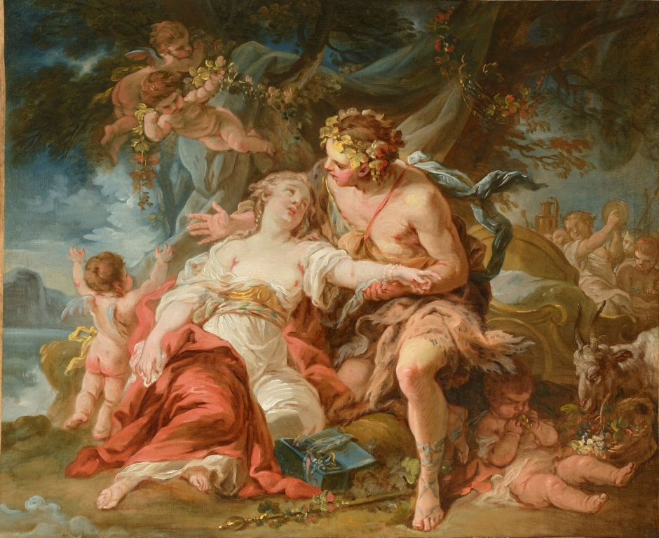 Notre petit tableau s’inscrit dans la tradition du fastueux XVIIIe siècle français qui fit de ce mythe une véritable célébration de l’amour galant. Tenus à distance l’un de l’autre par l’étiquette stricte du Grand siècle, Bacchus, attentionné et tendre, et Ariane, dénudée mais chaste, se touchaient enfin. Cette première étreinte pudique était prétexte au déploiement d’un somptueux cortège composé de satyres rieurs, de bacchantes couronnées de lierre, de putti espiègles, de petits amours virevoltant dans les airs et d’animaux. Le dieu du vin et de la fête apparaissait entouré de toutes les richesses de la nature et d’une multitude d’objets précieux : guirlandes de fleurs, paniers de raisins, char d’or tiré par les léopards, vases, joyaux, instruments de musique. Antoine Coypel dès 1693 (Philadelphie, Museum of Art, inv. 1990-54-1), puis François de Troy en 1717 (Berlin, Kaiser Friedrich Museum, inv. KFMV.241), François Lemoyne (dessin dans une collection particulière), Charles Joseph Natoire en 1743 (Versailles, inv. MV 7698), François Boucher vers 1749 (perdu), Carle Van Loo (coll. part.) ou Louis Lagrenée en 1757 et 1768 (collection particulière ; Stockholm, Nationalmuseum, inv. NM 841) : les peintres de l’Académie royale rivalisaient d’ingéniosité pour mieux chanter les amours du dieu et de la mortelle Ariane et satisfaire le goût exigeant de la cour de France.
