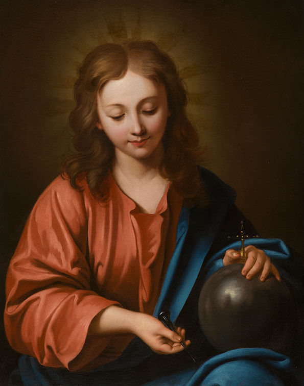 Louis de Boullogne peint ici dans une technique parfaite, selon une iconographie originale, un Christ à la grâce juvénile tel qu’il a pu apparaître à douze ans aux Docteurs de la Loi. En contre-point de ce charme adolescent, le clou et la croix préfigurent les souffrances de la Passion. Le globe rappelle le caractère universel de la mission rédemptrice du Salvator Mundi.