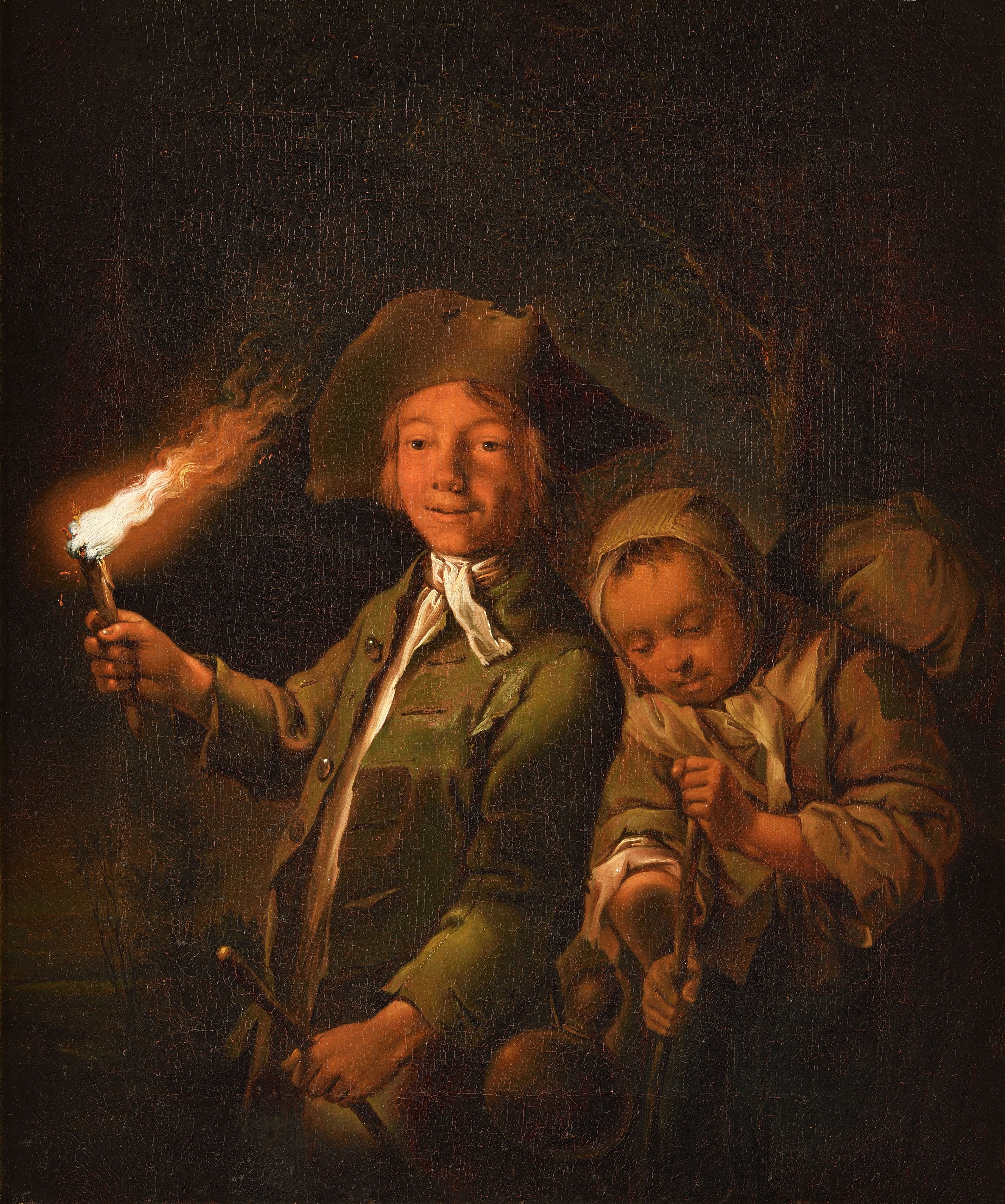 Jeune homme tenant une torche accompagné d’une jeune paysanne et son baluchon