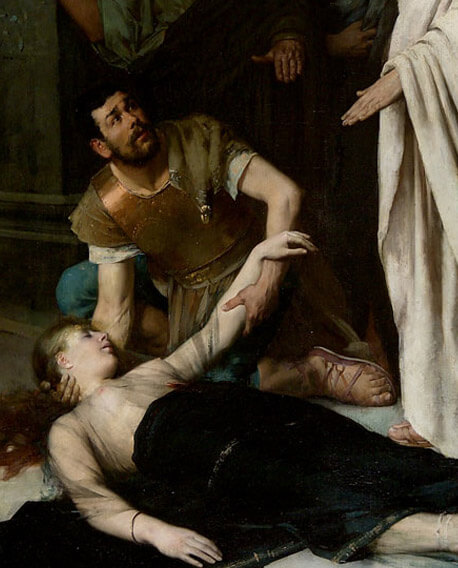 Notre huile sur toile probablement exposée au concours du Prix de Rome en 1883 illustre un passage de l’histoire romaine du VIe siècle avant Jésus Christ, s’imposant comme un morceau de bravoure de l’art pompier. De composition pyramidale, l’œuvre dévoile la scène tragique au premier plan, : Lucrèce, l’épouse mourante de Lucius Traquinius Collatinus gît à terre, son mari à genoux lui prend la main, le père de la jeune femme est derrière le mari, nous retrouvons également le messager et Brutus qui ferme la pyramide. Entre mythe et réalité, l’histoire antique nous lègue le récit suivant : à la suite du déshonneur enduré, Lucrèce envoie un messager chercher son mari et son père, que nous retrouvons dans notre composition rassemblés autour de la jeune femme. Sur le chemin qui les ramène à la maison, Lucius croise son ami Brutus, neveu du roi Tarquin le Superbe qui décide de les accompagner. Sur le lieu du drame, Lucrèce fait porter serment à son mari Lucius de la venger puis se suicide.