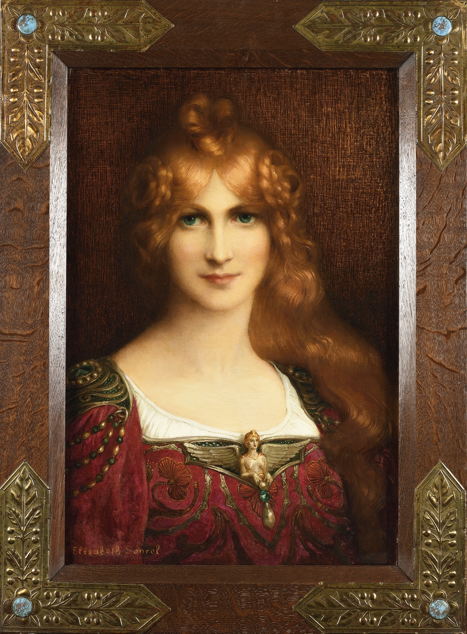 Portrait rêvé, notre tableau est doté d’une énergie plus profonde. Les bijoux or et vert qui parent la jeune femme lui confèrent une touche de mystère. Le haut de ses manches est recouvert d’ornements en métal précieux tandis que le corsage est rehaussé d’un grand bijou en forme d’un buste de femme nue aux grandes ailes déployées et qui soutient un pendentif formé d’une émeraude et d’une perle. Celle-ci a le regard impénétrable et la gravité d’une sphinge, mais ses mains visibles contredisent cette supposition. Élisabeth Sonrel faisait parfois reproduire certaines pièces de joaillerie à partir de ses dessins. Aussi, le choix des bijoux dans ses tableaux n’est jamais anodin. Ici, la créature fabuleuse fait de la dame une figure ambivalente entre sagesse et séduction, impression renforcée par son regard bleu-vert, de la même couleur que la pierre tenue par la créature ailée.