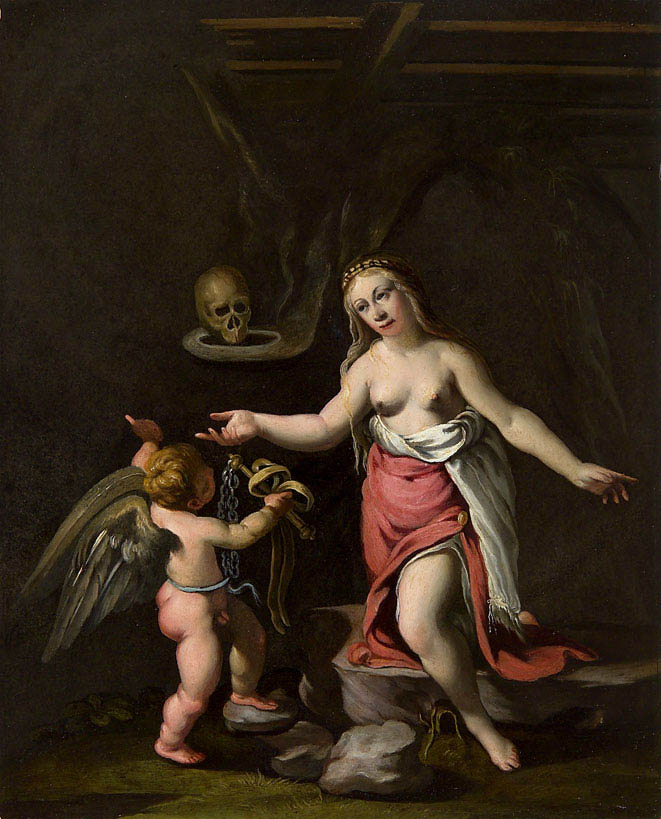 Dans un geste d’abandon, mais néanmoins gracieux, elle tend les bras vers un putto qui lui tend un fouet.