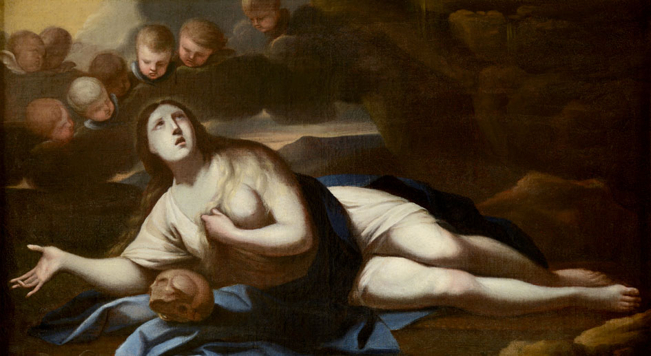 Baugin figure la sainte allongée dans un paysage aride, à peine éclairé par les lueurs du crépuscule. Bien qu’à demi-dénudée, ses longs cheveux couvrant l’épaule, la Madeleine n’est pas ici la femme séduisante et sensuelle que peignait Guido Reni. Son expression austère et ses chairs blêmes, rappelant la peinture de Philippe de Champaigne, sont le reflet d’une âme travaillée par la douleur de la repentance. Son corps blafard évoque celui du Christ mort pleuré par deux anges (Musée des BeauxArts d’Orléans).