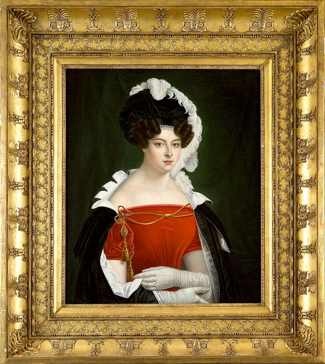 Ici, Riesener renforce la palette chromatique de la robe rouge de notre princesse par le traitement d’un fond vert olive soutenu. Le béret en velour rehaussé de plumes d’autruche ainsi que la cape doublée de soie, fermée par un cordon de fils d’or, confèrent à notre modèle inconnu une belle prestance.