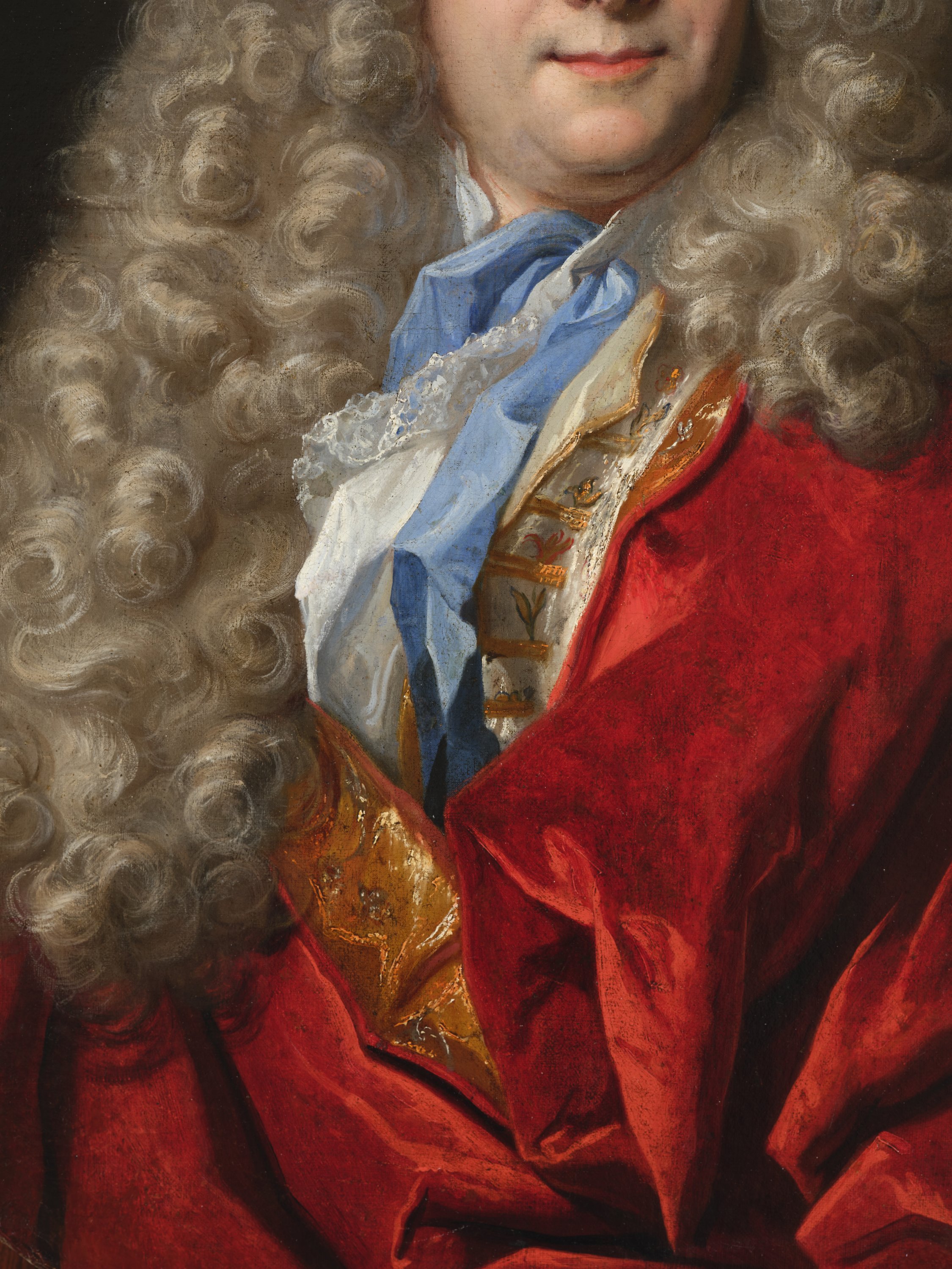 Notre tableau présente l’un de ces portraits très appréciés par la haute société. Dépeint sur un fond sombre, un homme est représenté en buste, légèrement de trois quarts. Sa silhouette disparaît sous les plis opulents d’un manteau de velours d’un rouge flamboyant laissant apparaître une doublure de brocards d’or et une cravate de dentelle bleue et blanche, couleurs royales. Calme et serein, le visage de cet homme fixe intensément le spectateur. L’œil est attiré par sa volumineuse perruque à hauteur dite « à la royale », retombant sur ses épaules. Plus qu’un élément de confort et de prestance, la perruque est un accessoire de mode indispensable, symbole de distinction, de richesse et de pouvoir.