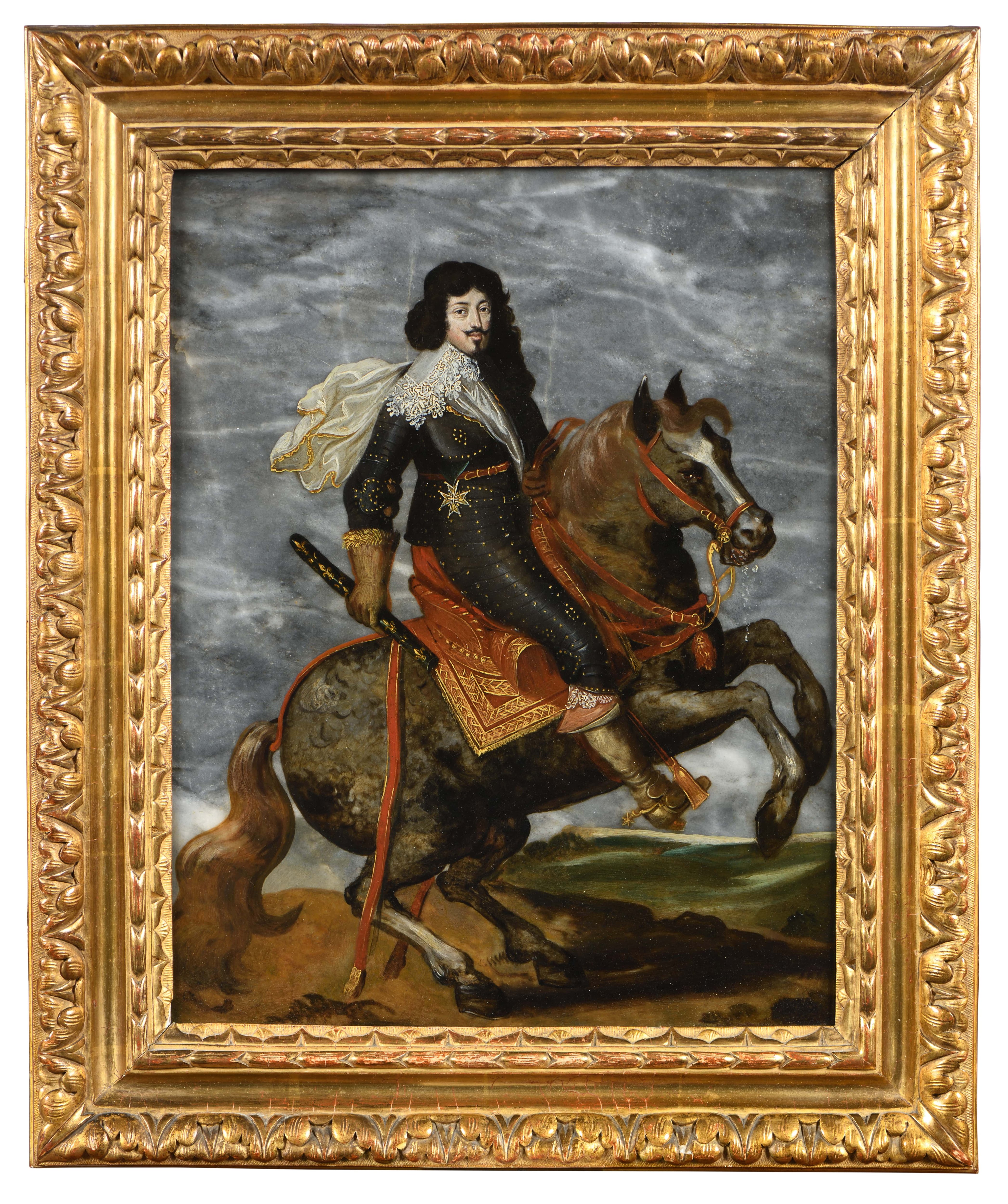 Dans cette œuvre vraisemblablement réalisée autour de l’année 1640, Claude Déruet dépeint le roi Louis XIII quelques années avant son décès prématuré à l’âge de 41 ans. Le réalisme avec lequel l’artiste traite le visage du monarque au regard vif et pénétrant permet de rendre les détails physiques connus dont le creusement des joues et le menton marqué. Le roi est représenté en tenue militaire, tenant d’une main ferme le bâton de commandement. Il porte la cuirasse ornée de l’écharpe du Saint-Esprit sur laquelle apparaît l’écharpe blanche volant au vent, marque du pouvoir royal en France. Il est chaussé de bottes de chevreau au rabat de cuir beige doublé de soie rouge apposé sur le dessus du pied permettant de ne pas user le cuir par le frottement des étriers, que l’on retrouve dans quelques illustres autres portraits du monarque tel que celui réalisé par Philippe de Champaigne vers 1639.