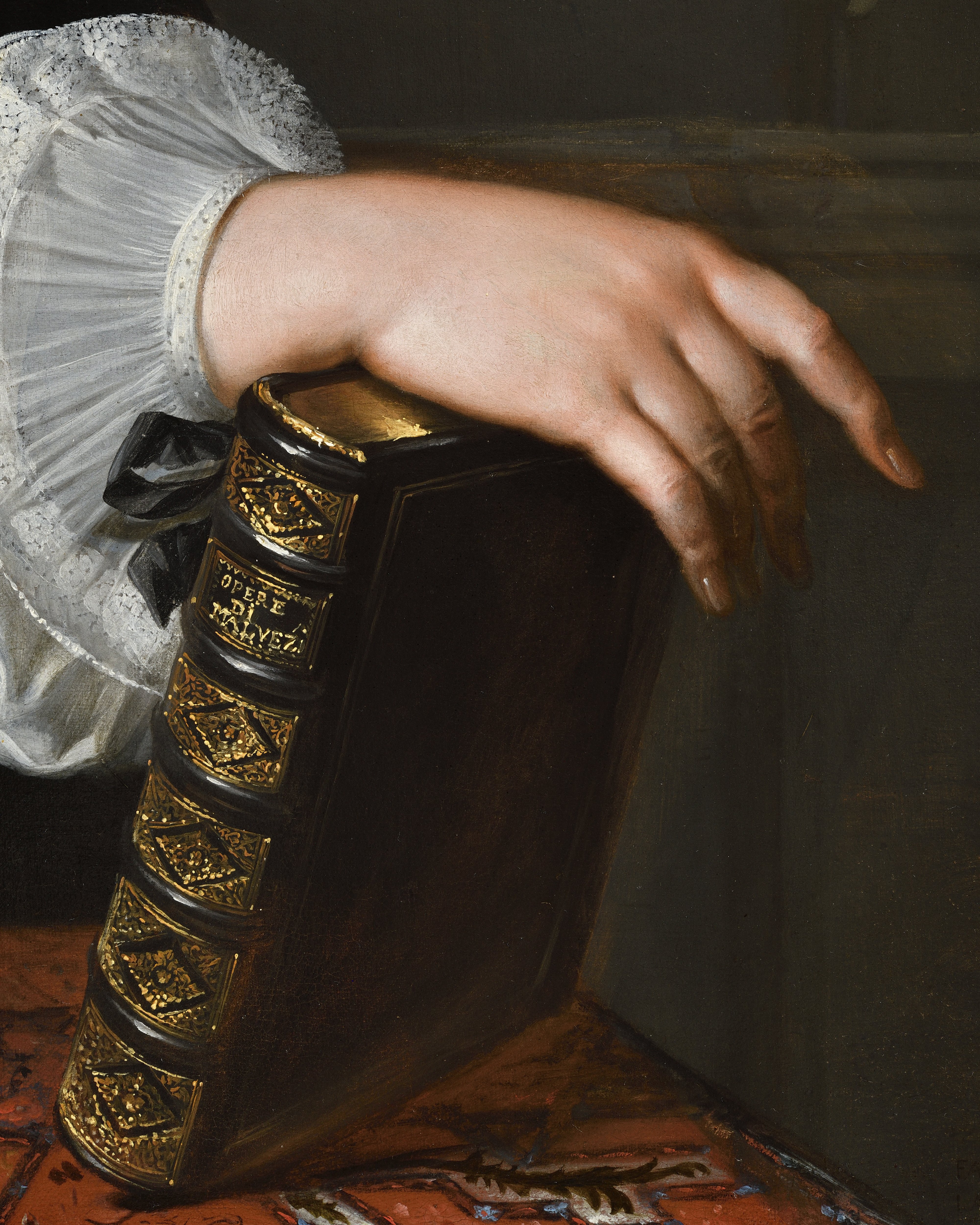 Devant lui, une table couverte d’un tapis oriental brodée de motifs floraux et végétaux stylisés. Tandis que sa main gauche est dissimulée dans les plis de sa robe, sa main droite est fièrement posée sur un épais livre couvert de maroquin noir. La tranche de l’ouvrage, estampée de motifs d’or porte l’inscription « Opere di Malvezi ». Le livre, symbole d’érudition et d’autorité intellectuelle, est souvent retenu dans les portraits comme affirmation d’un rôle dans l’administration, la magistrature où les affaires d’État. Plus encore ici, l’auteur, Virgilio Malvezzi (1595-1654), est un écrivain italien engagé dans la diplomatie et l’histoire politique, fortement apprécié pour ses biographies romaines et bibliques.