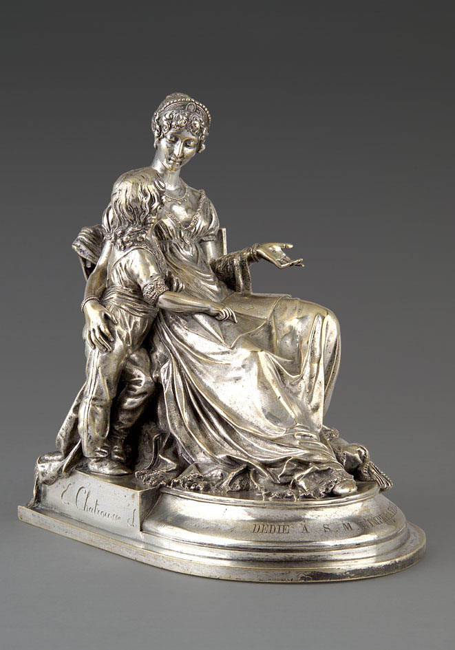 Groupe en bronze argenté. Signé Chatrousse et dédié à S.M. l’Impératrice sur la terrasse.