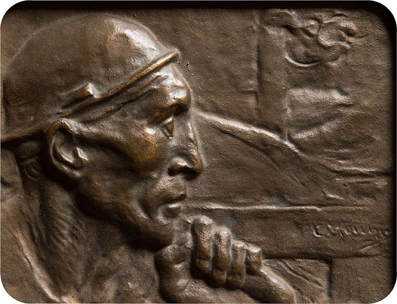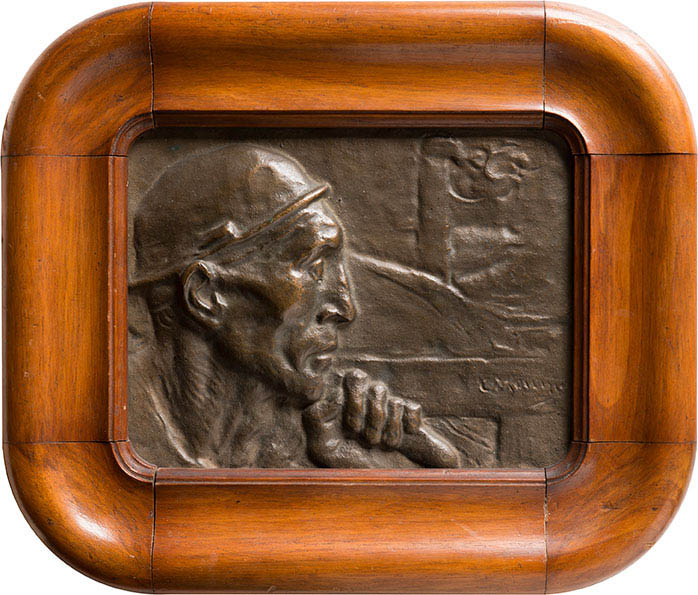 Notre Tête de mineur est une belle illustration de cet art social cher à Meunier. C’est le marchand de charbon et amateur d’art Edouard Taymans qui, en 1904, lui passe commande d’une plaquette qu’il offrira à ses meilleurs clients. Le bas-relief réalisé par Meunier un an avant sa mort propose un mineur au profil émacié, dont les traits sont marqués par le dur labeur. En arrière-plan, la cheminée et le terril rappellent la réalité de son travail. Il existe des versions en plâtre, bronze et grès de cette œuvre, dont un exemplaire d’édition conservé au Musée d’Orsay. Cette « plaquette Taymans » rappelle dans ses formes le bas-relief de bronze que le sculpteur avait exposé au Salon en 1893, Mineurs à la sortie du puits, qui présent un même type de figures de profil, fatiguées par le labeur du Pays noir.