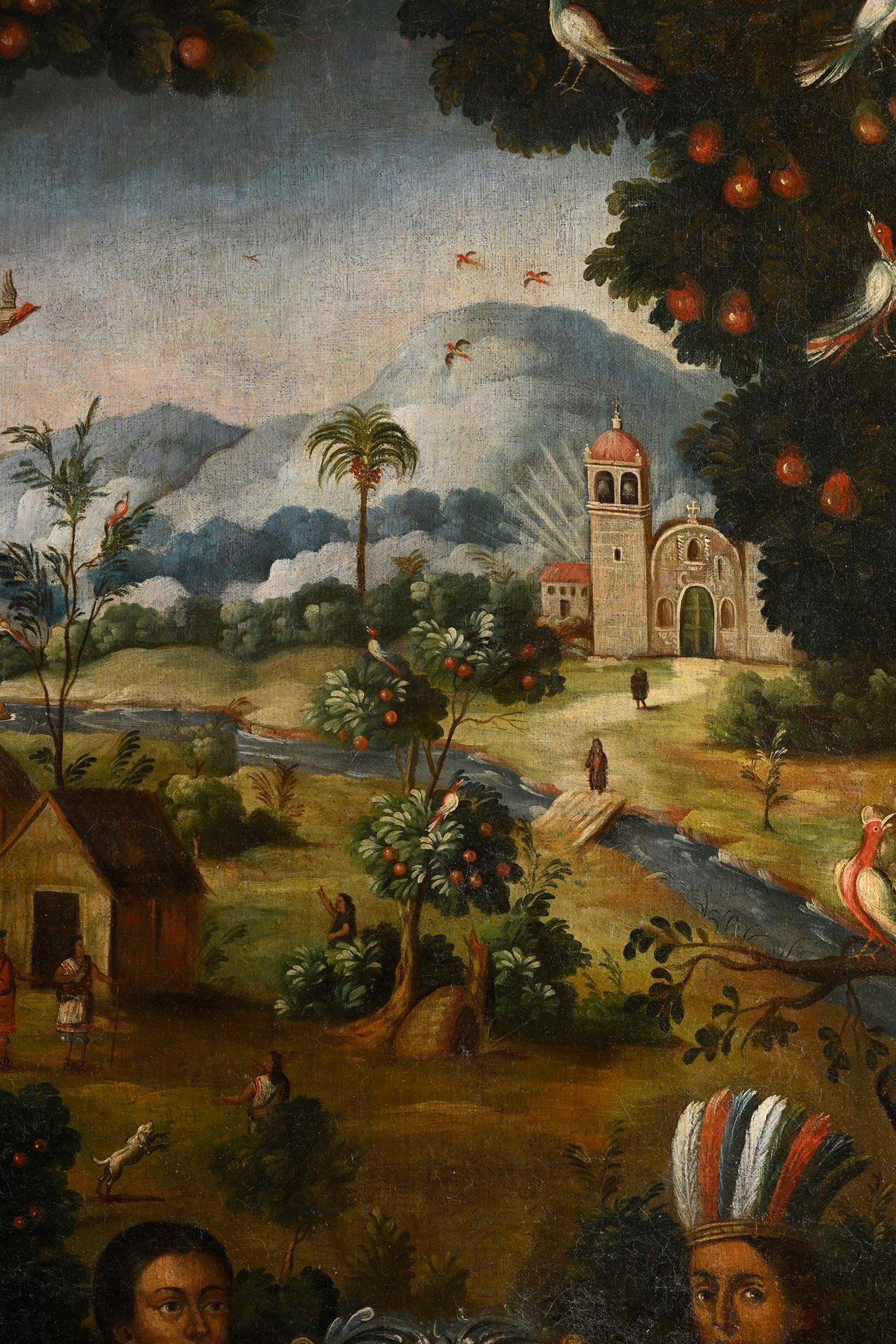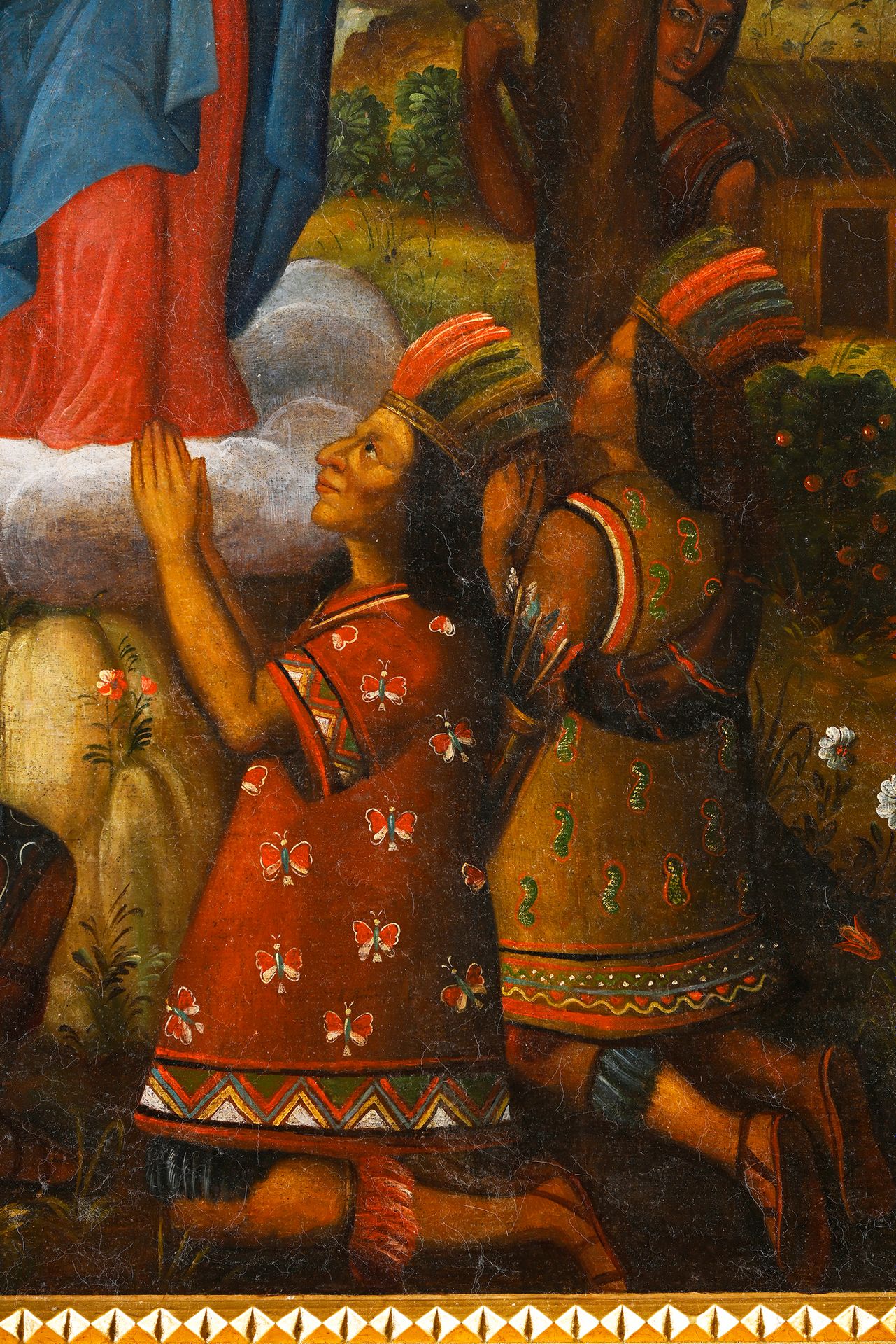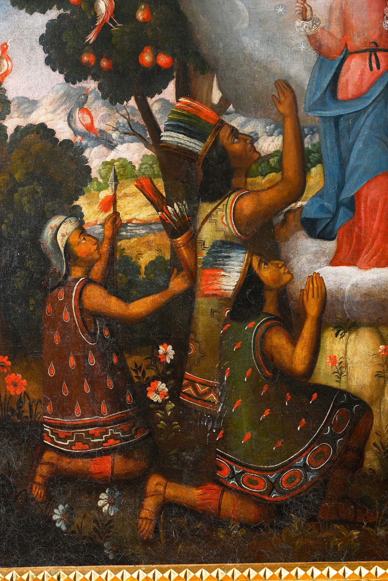 L’imposant format de cette toile est à la hauteur du sujet représenté : la Vierge de Caima, assure protection et prospérité au peuple indien incas. Elle est la Vierge de la Purification honorée le 2 février tout comme la fête de la présentation de Jésus au temple, coïncidant avec celle de la Chandeleur. Au premier plan à gauche, 5 personnages indiens adorent la Vierge. À droite, 2 personnages féminins tiennent en leur mains un médaillon présentant la Vierge comme la « Bienfaisante des Indiennes malheureuses ». L’influence flamande est tout à fait sensible à travers une nette division verticale de la composition dont l’arrière-plan à droite découvre un paysage montagneux détaillé avec minutie : des maisons d’un village et plus loin, une église de Caïma près d’Aréquipa, toujours existante et que le tableau a fidèlement reproduite. L’ensemble de la composition révèle une nature luxuriante riche de fleurs, fruits et oiseaux dans un souci décoratif cher aux artistes sud-américains, et qui représentent des croyances incaîques.