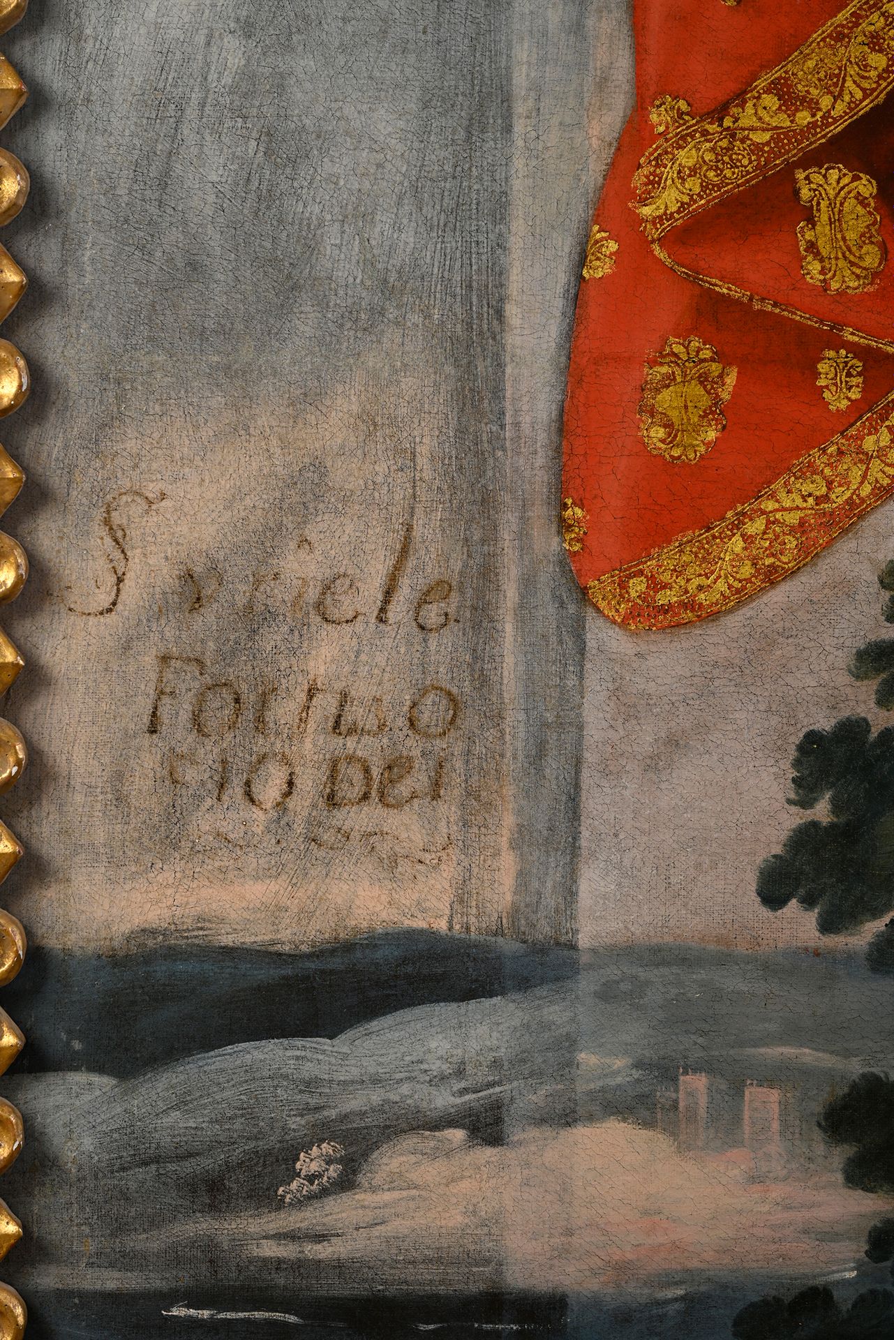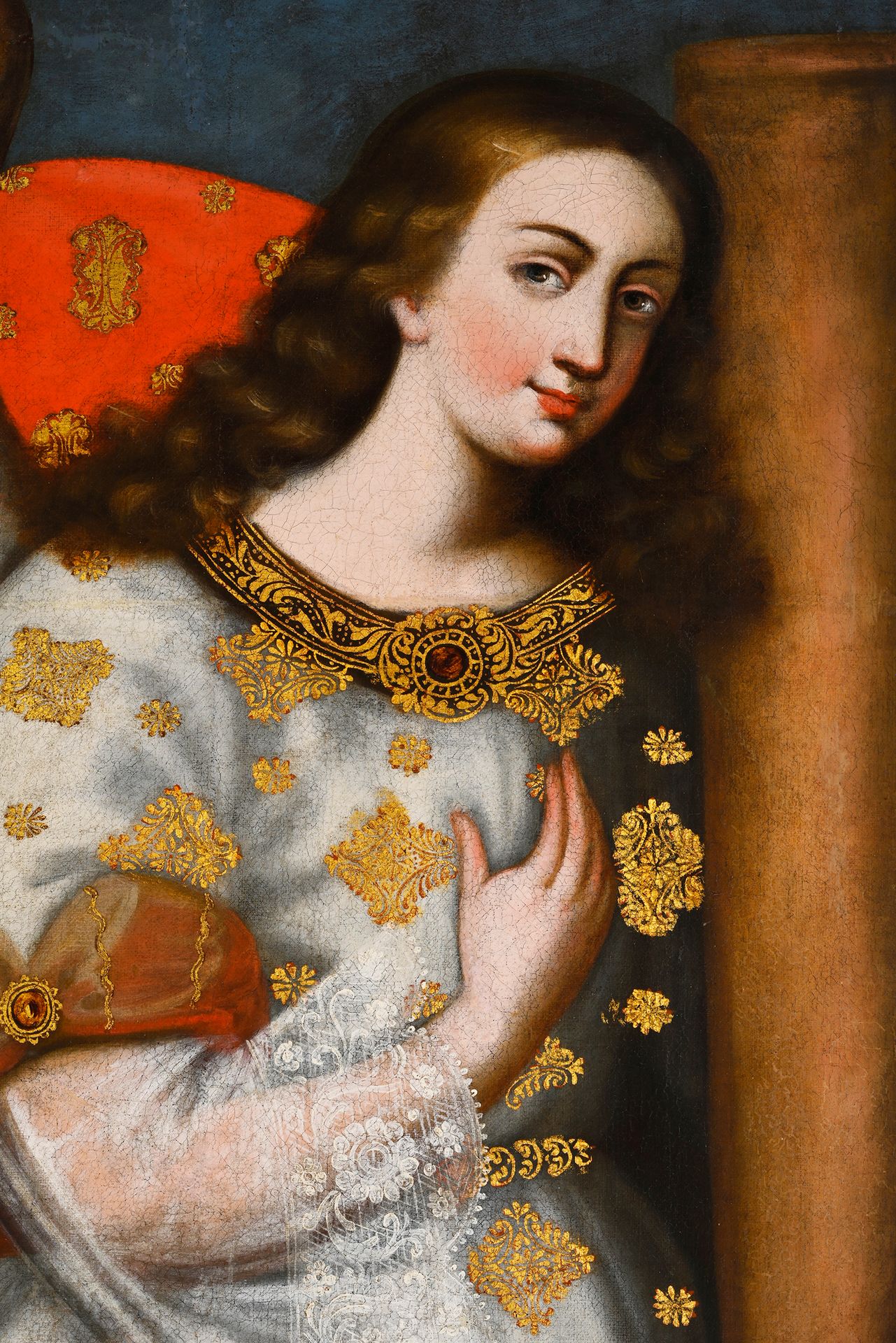 Vêtu de somptueux drapés rehaussés d’or, la figure de ce messager de Dieu annonce sa gloire. Le voile apparaissant sur la gauche de la composition comporte le message « S. Uriele Fortis o[r]io Dei », Uriel fort par la parole de Dieu.